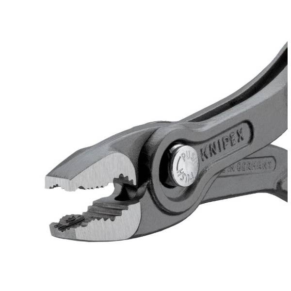 Ein kompaktes Werkzeug für einen schnellen, beschädigungsfreien Griff an hartnäckigen Befestigungen. Die Knipex TwinGrip 150 mm kombiniert Front- und Seitenzangen-Griff, sodass Sie in abgenutzte, runde oder schwer erreichbare Schrauben und Muttern von oben oder von der Seite beißen können, um dann mit Kontrolle zu drehen, zu halten, zu drücken oder zu ziehen. Ein mehrstufiger Druckknopf-Schiebemechanismus ermöglicht es Ihnen, die genaue Zangenbreite in Sekunden einzustellen, während das starre Boxgelenk, der Quetschschutz und die dreipunktige Frontgriffgeometrie stabilen, rutschfesten Kontakt selbst bei dünnen, flachen Werkstücken bieten. Aus verchromtem Vanadium-Elektrostahl geschmiedet, ölgehärtet und mit induktionsgehärteten Zähnen (~61 HRC) versehen, ist der TwinGrip für jahrelangen präzisen, zuverlässigen Einsatz an der Werkbank, in der Werkzeugkiste oder unterwegs gebaut.