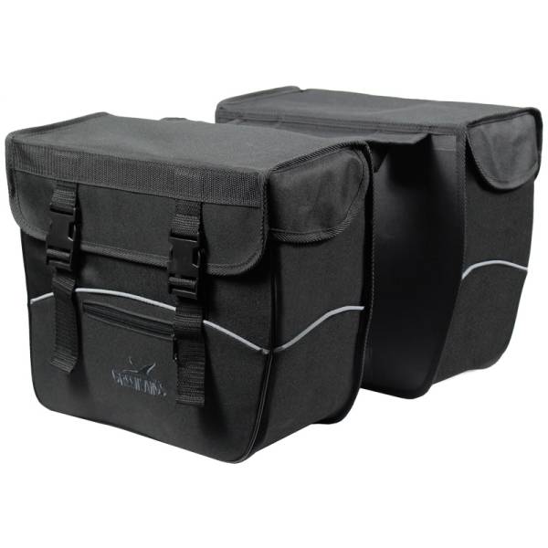 The double bicycle bag is reinforced with a hardbox system, making it exceptionally suitable for transporting heavier items. It's ideal for daily use and is quick and easy to mount. The reflective strips ensure that you are highly visible during twilight or in the dark, contributing to cycling safety! The double bags are equipped with a spacious main compartment and a front pocket with a zipper. The angled edges prevent you from kicking the bag while cycling.