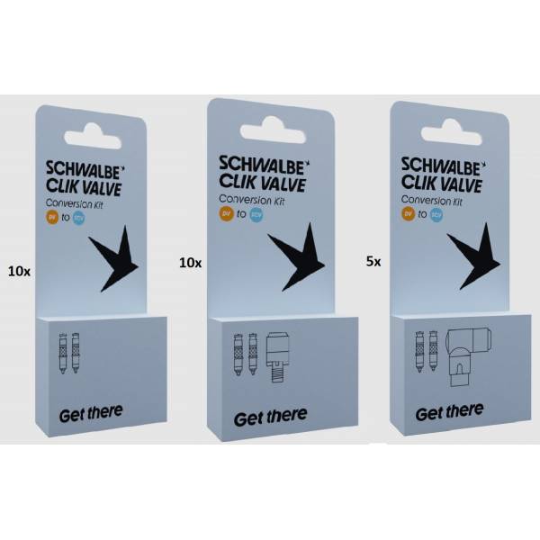 L'ensemble se compose de valves et de kits de conversion qui facilitent la conversion de vos valves Sclaverand/Presta en valves Schwalbe Clik.