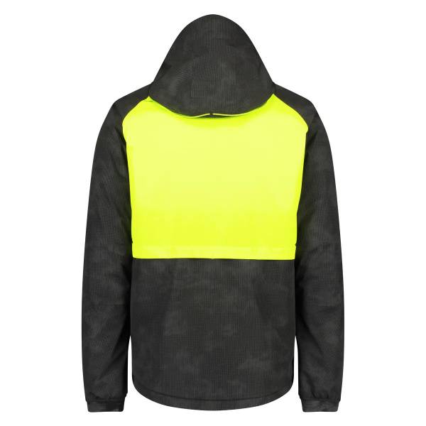 Questa giacca impermeabile è composta interamente da elementi giallo neon e pannelli riflettenti.
