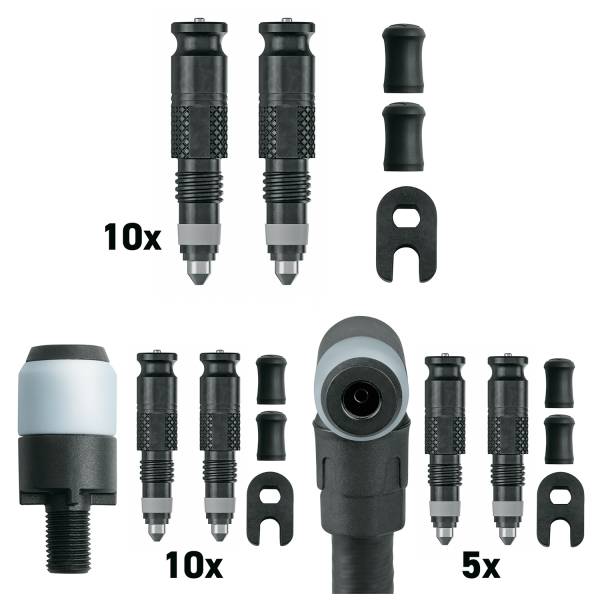 O kit inicial Schwalbe Clik SV-SCV é um pacote pronto para oficina que utiliza uma interface de conexão rápida e segura para tornar a inflação tubeless e as recargas de selante rápidas, limpas e consistentes—perfeito para lojas, equipes e manutenção de frotas. O que vem na caixa: 10× Clik SV-SCV, 10× Clik SV-SCV com cabeçote de bomba e 5× Clik SV-SCV com adaptador de cabeçote de bomba.